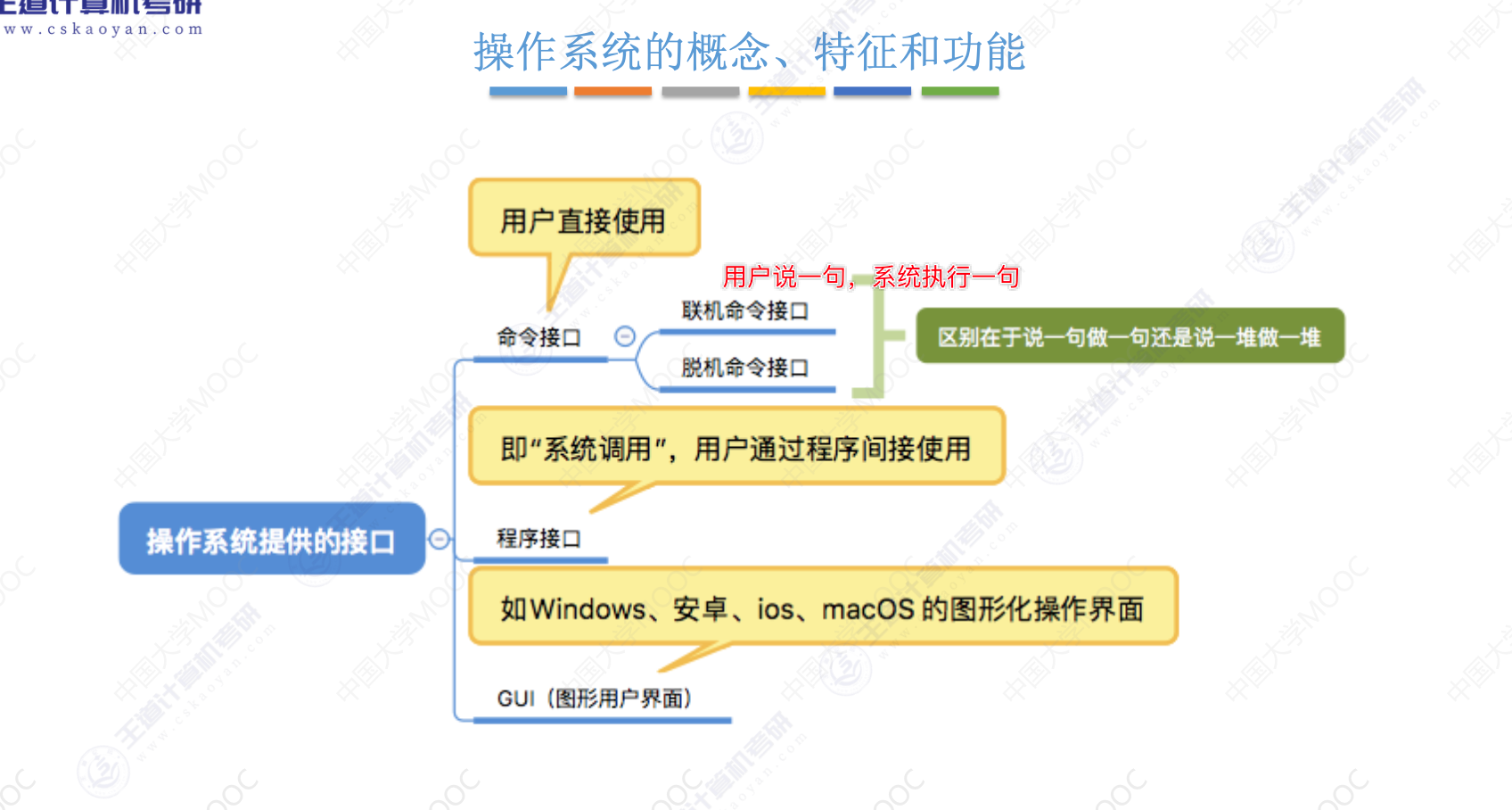 目录 第一章 计算机系统概述 1.基本概念 2.内核态和用户态 3.中断(外中断)、异常(内中断-与当前执行的) 4.系统调用 5.操作系统引导程序 2021年真题: 6.操作系统结构 大纲新增 (1)分层结构 (2)模块化 (3)外核 7.虚拟机 第二章 进程管理 1.画作业运行的顺序和甘特图 2.进程和线程的区别 3.进程状态和进程的控制 4.处理机调度 5.进程同步和互斥 (1)实现进程互斥的软件方法 (2)实现进程互斥的硬件方法 (3)互斥锁(通常用硬件机制来实现) (4)信号量机制 哲学家问题 6.死锁 第三章 内存管理 1.程序运行的基本原理 2.内存分配 (1)连续分配方式 内存保护 内存空间扩充 动态分区分配算法 (2)非连续分配方式 ①对于基本分页方式 ※基本地址变换机构:重点 ②基本分段存储管理 3.虚拟页式存储(大题最常考题型!!) (1)TLB (2)页面置换算法 时钟置换算法(CLOCK) 改进型的时钟置换算法 4.页面分配策略 5.程序运行时的内存映像和地址空间 6.内存映射文件 第一章 计算机系统概述 1.基本概念
