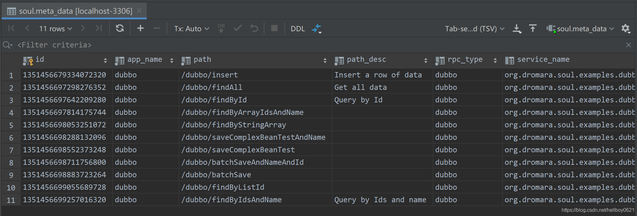 数据库中之前空的元信息表中也有信息了,正好11条数据,对应11个接口信息: