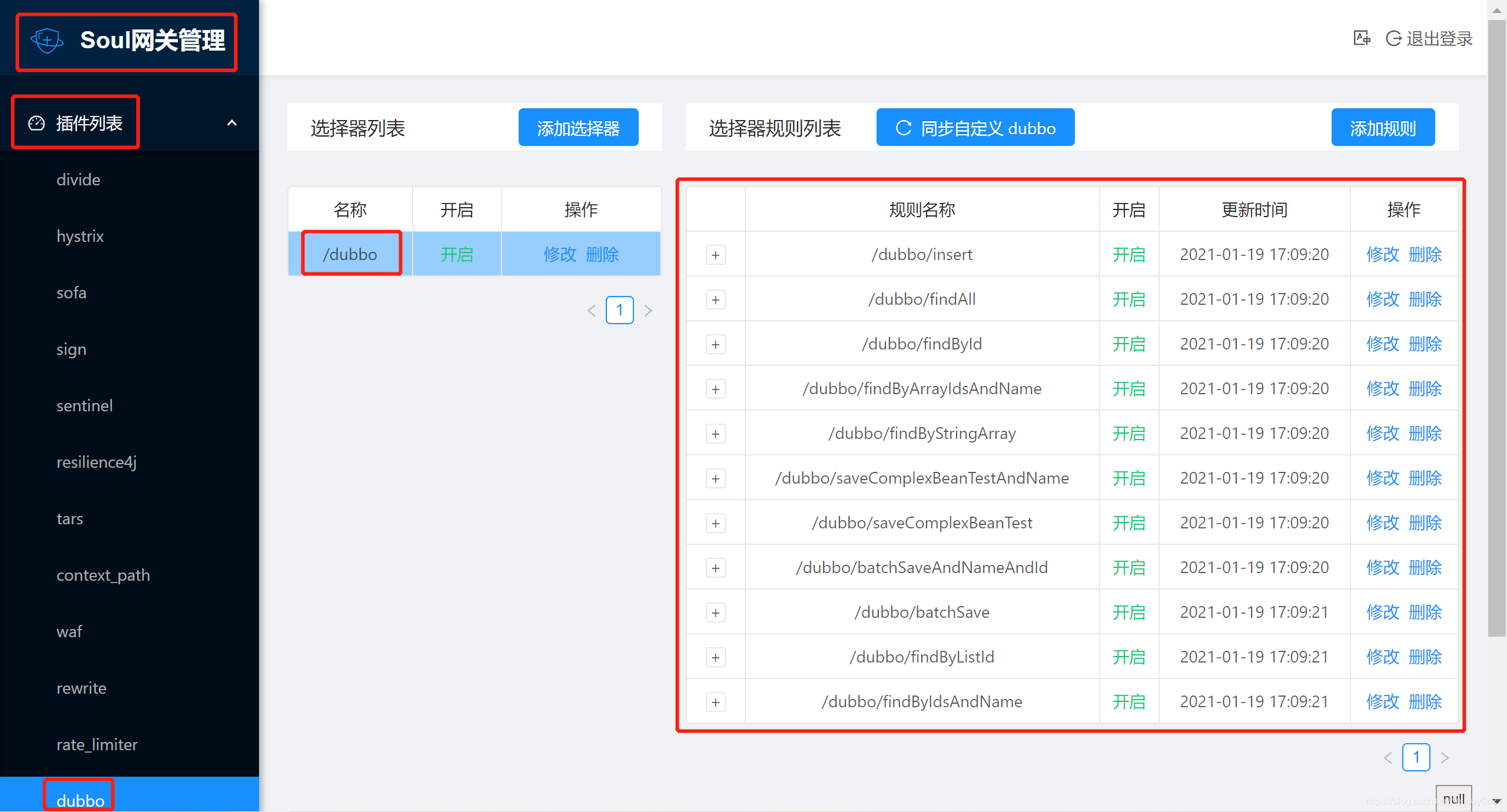 在 soul-admin web 页面可以看到 dubbo 接口注册进来了。