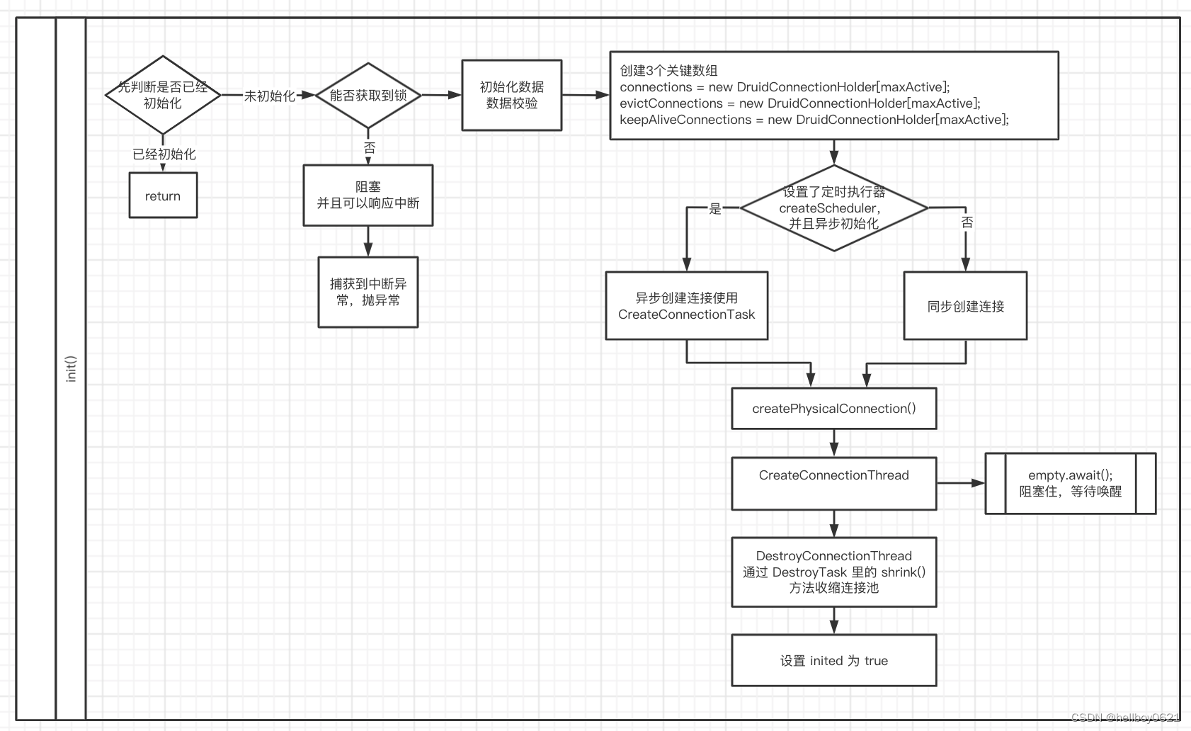 - 如果连接池中没有可用连接时,阻塞,并且通知创建线程恢复,待创建连接后,再通知获取连接线程恢复,获取到连接。