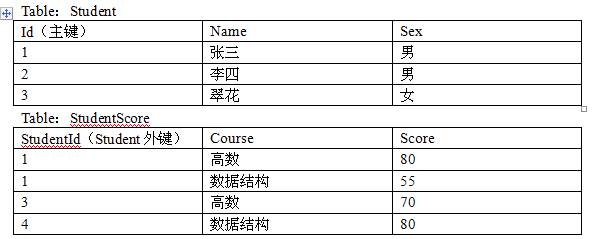 1、现有两个表Student。 StudentScore,如下: