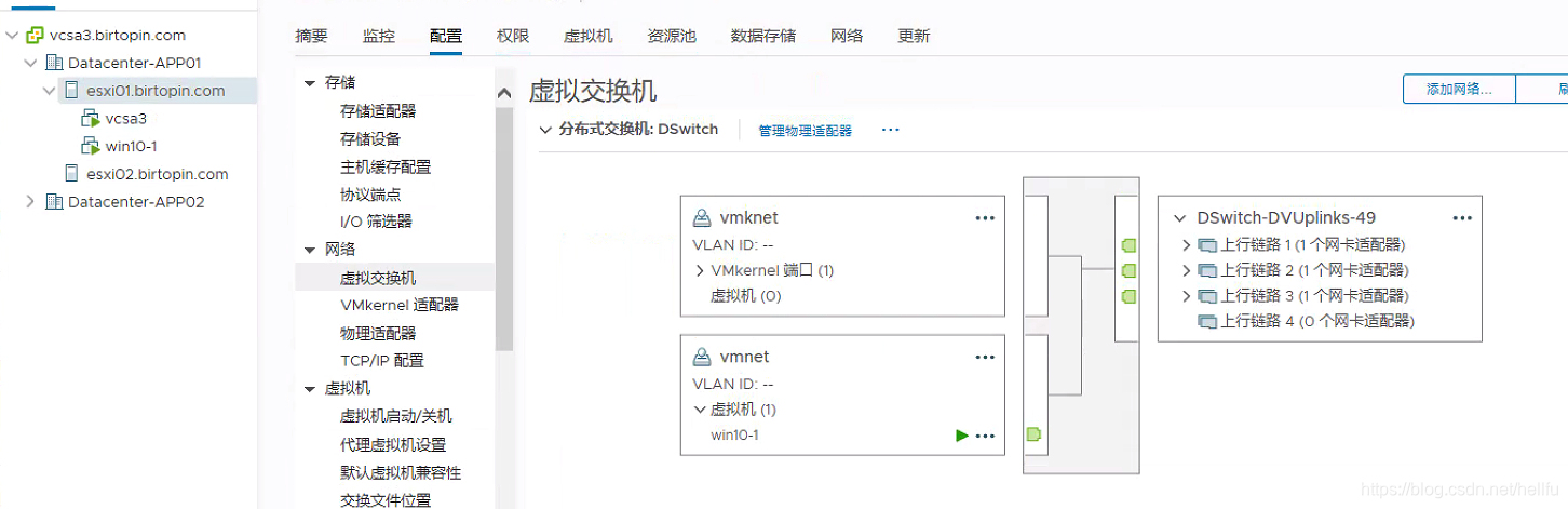 vcsa3主机是vc所在的环境,管理着此vc上的所有主机,优先处理,将vc桥接到网络“vmnet”,原因是vmnet在使用的网卡是上行链路1(vmnic1),同上行链路4(vmnic0)在同一个网络环境