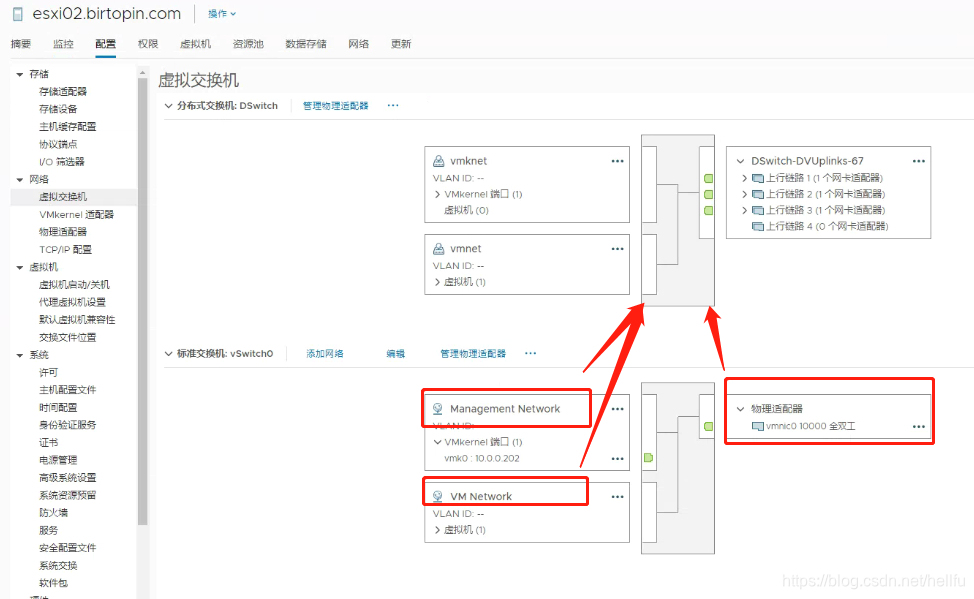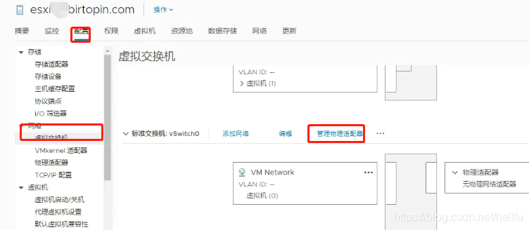 3、主机1,配置,网络,虚拟交换机,标准交换机,“管理网络适配器”,添加物理适配器vmnic0