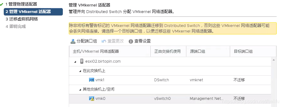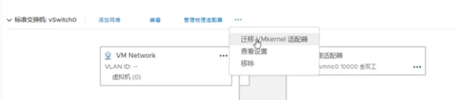 4、端口组迁移到标准交换机,在标准交换机上选择“迁移VMkernel适配器”,将原来迁移过来的vmk0进行迁移,命名依旧是使用迁移前的Management Network 。