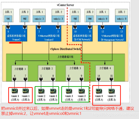 要保证vmnic0和vmnic1在一起,也就是上行链路4和上行链路1要在一起,同时不能有其他网络干扰