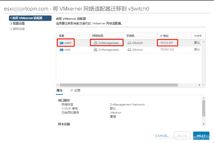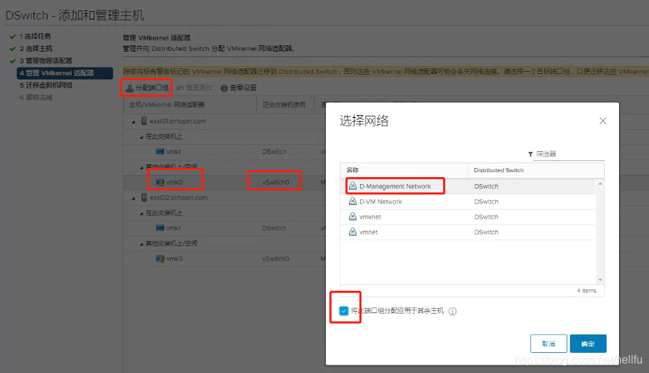 4)管理VMkernel适配器(将标准交换机的vmk0迁移到VDS的D-Management Network)