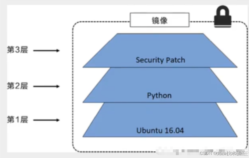 示例:基于 Ubuntu16.04创建一个新的镜像,这就是新镜像的第一层。如果在该镜像中添加Python包,就会在基础镜像层之上创建第二个镜像层。如果继续添加一个安全补丁,就会创健第三个镜像层,如下图所示: