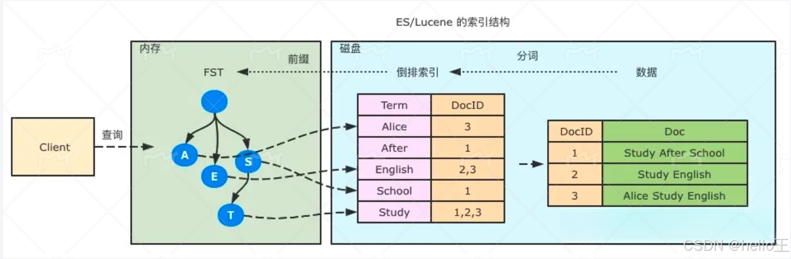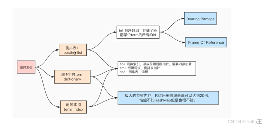 在倒排索引中,有词条(Tem)、词项词典(Term Dictionary)、倒排表(Post List)三部分,下面我们一一介绍。