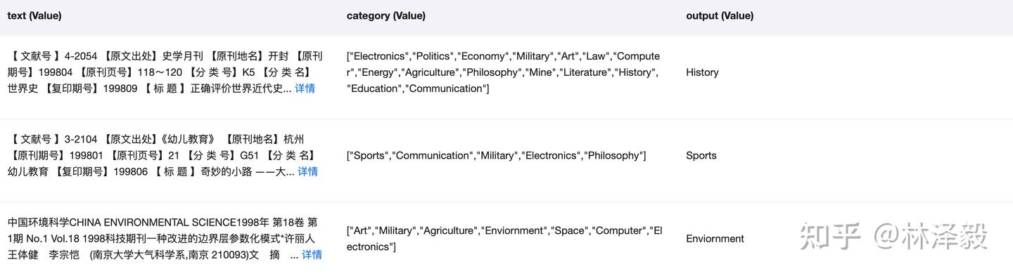 该数据集由几千条数据组成,每条数据包含text、category、output三列:
