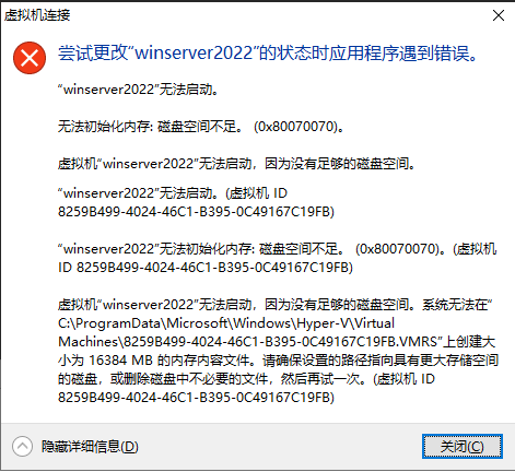 今天在启动一个hyper-v虚拟机时出错了,没有成功启动起来,报错信息大概为:无法初始化内存: 磁盘空间不足。 (0x80070070)。虚拟机“winserver2022”无法启动,因为没有足够的磁盘空间。具体错误如下图所示: