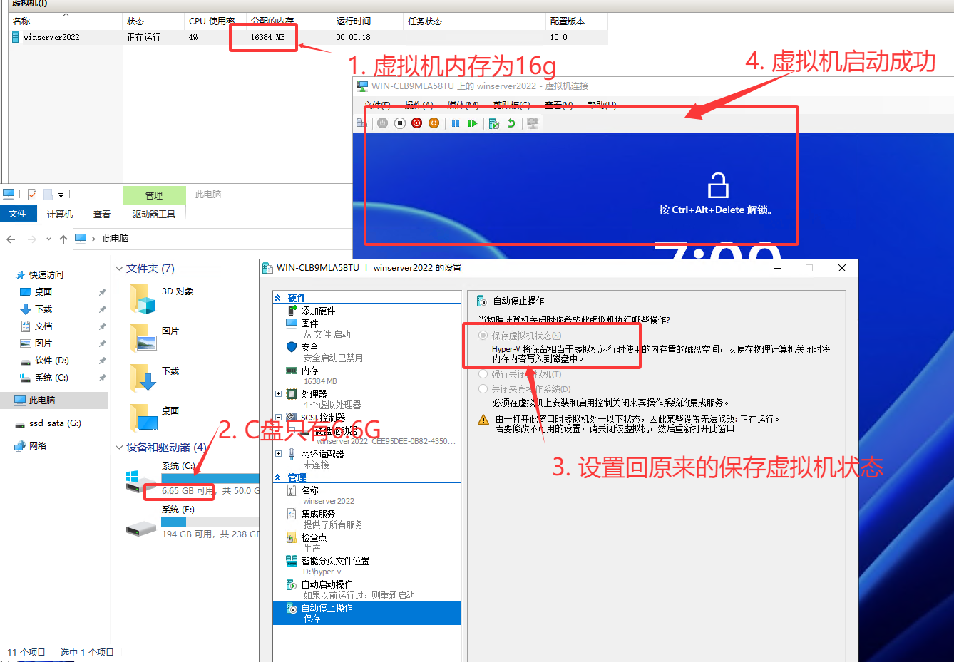 所以就有了点4的方法。点4的方法也比较简单(执行以下操作前,先把【自动停止操作】改回原来的【保存虚拟机状态】):右键虚拟机,选择移动,然后选择【移动虚拟机的存储】->【将虚拟机的所有数据移动到一个位置】,把虚拟机移到其他分区即可(为了更真实测试,在移动虚拟机后,可再往c盘填大文件,使其可用空间少于16G),步骤也不再赘述,下面是成功启动的界面及说明: