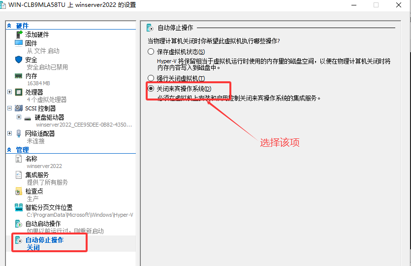 (2) 对于上述点3,因为vmrs内存内容文件是用于保存虚拟机内存状态的,所以将虚拟机配置为不保存内存状态即可,即把虚拟机的【自动停止操作】由原来的【保存虚拟机状态】改为【关闭来宾操作系统】即可,设置如下所示:
