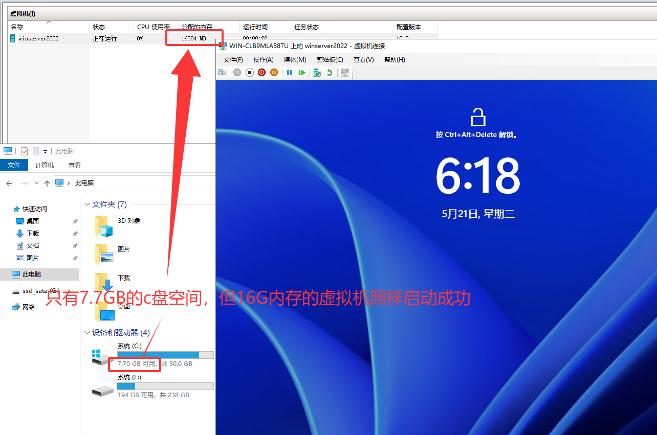 错误信息其实已经提示很明显,即C:\ProgramData\Microsoft\Windows\Hyper-V\Virtual Machines目录下的8259B499-4024-46C1-B395-0C49167C19FB.VMRS文件无法创建(16384MB,也即16G,也即当前虚拟机配置的内存大小),直白一点就是:C盘大小不够了(目前只有7.7GB), 如下图所示: