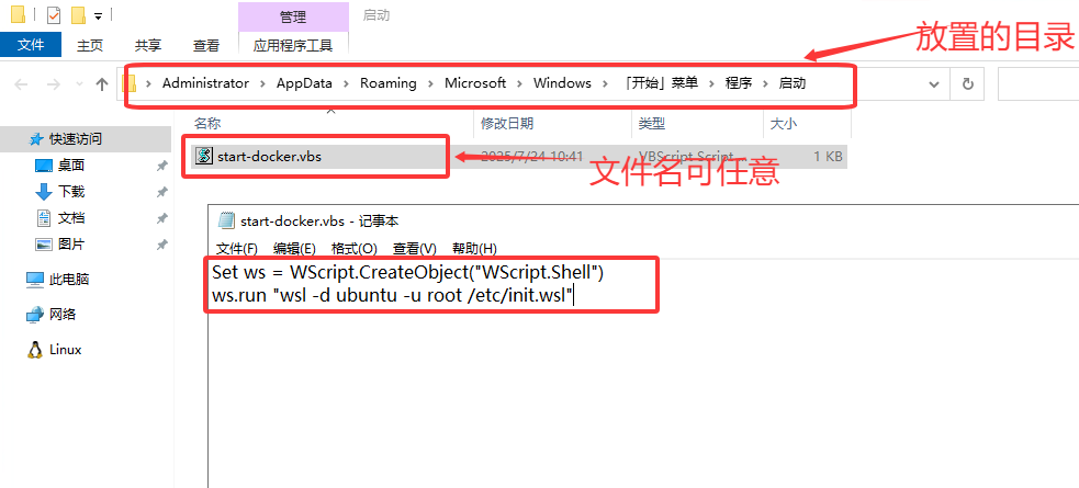 1.5 打开windows的自启动程序目录(按 win+R 输入 shell:startup),将上述vbs文件放入其中,如下图所示: