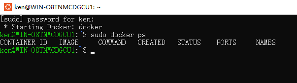 1.6 重启计算机后,直接进入到wsl下的ubuntu执行sudo docker ps,成功!如下图所示: