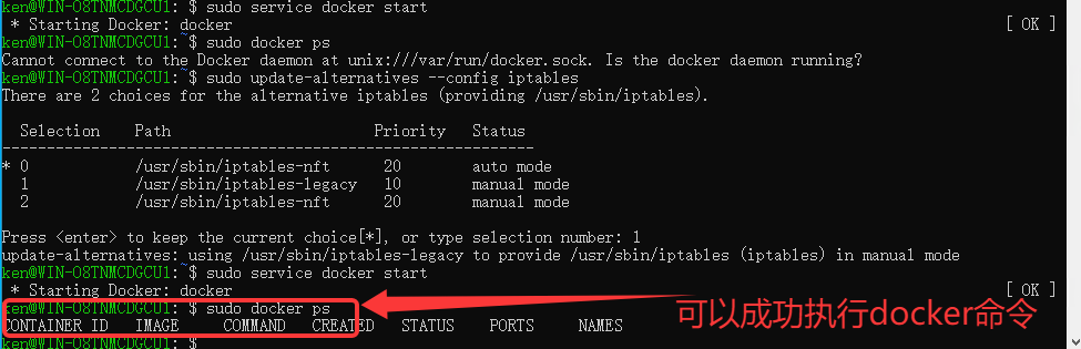 解析:这个说明docker没有正常启动,这个原因主要是wsl2造成的,所以直接使用命令sudo service docker start是无法成功启动docker服务的,这里需要更新iptables的相关配置(具体为什么这样做我不太懂,只知道确实有效),具体可参考这里:解决WSL2的ubuntu20.04中安装docker出现无法连接的问题(Cannot connect to the Docker daemon)_wsl2安装ubuntu的docker不行-优快云博客