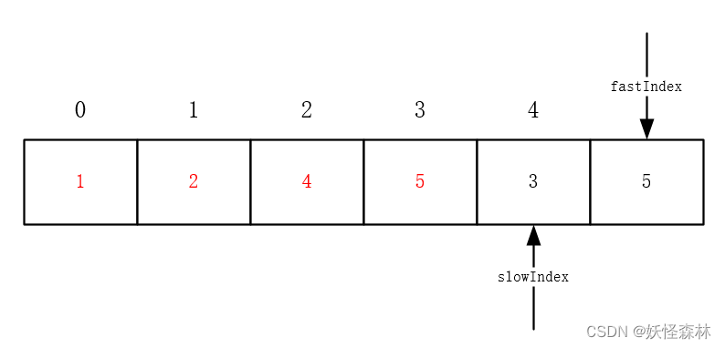 - 慢指针:获取新数组的下标值(也就是数组中需要更新的元素的位置)