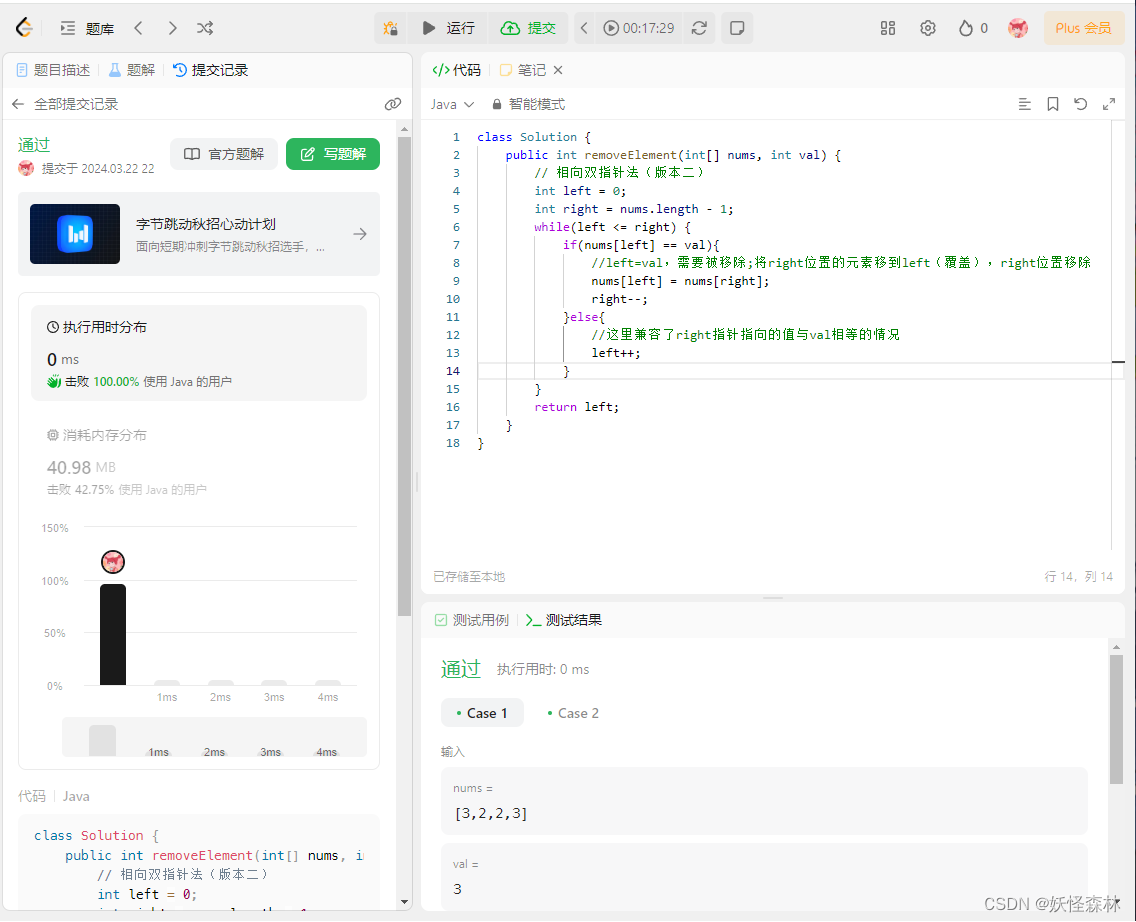 相向双指针法(版本一)其实就是右指针直接跳过了目标值的情况,不再赘述,可以自己理解一下,代码如下: