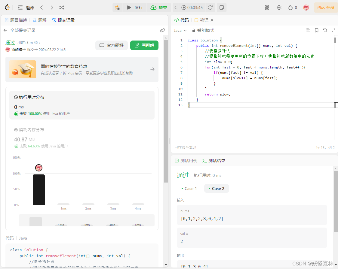 | 输入:nums = [3,2,2,3], val = 3 输出:2, nums = [2,2] 解释:函数应该返回新的长度 2, 并且 nums 中的前两个元素均为 2。你不需要考虑数组中超出新长度后面的元素。例如,函数返回的新长度为 2 ,而 nums = [2,2,3,3] 或 nums = [2,2,0,0],也会被视作正确答案。 |