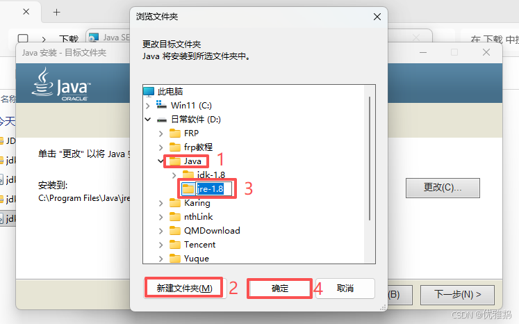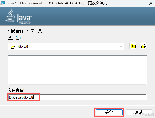 更改文件夹名,如D:\Java\jdk-1.8,然后点击“确定”