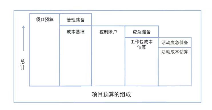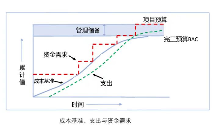 - 项目资金通常以增量的方式投入,并且可能是非均衡的,呈现出如图所示的阶梯状。如果有管理储备,则总资金需求等于成本基准加管理储备。