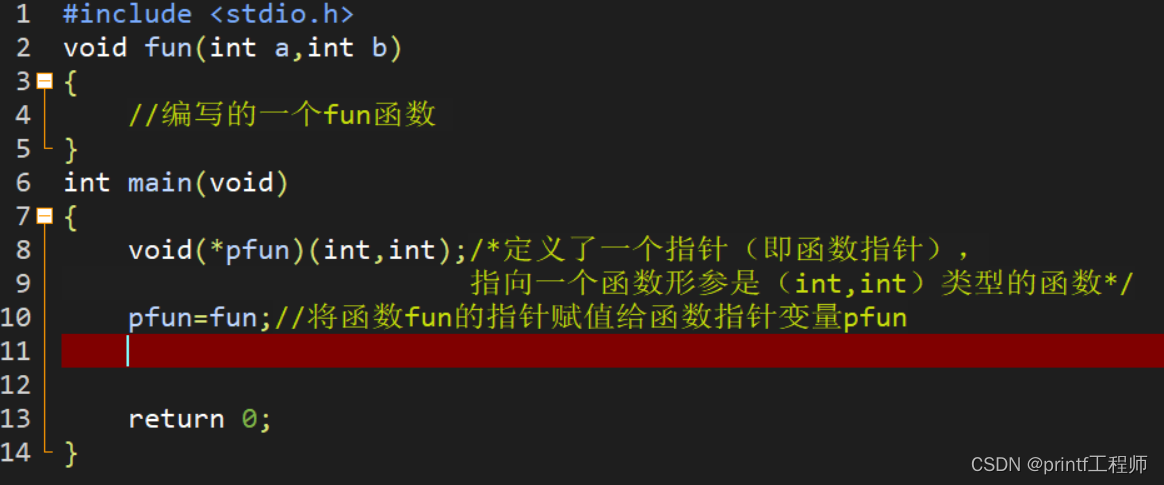 void(*pfun)(int,int);//定义了一个指针(即函数指针),指向一个函数形参是(int,int)类型的函数
