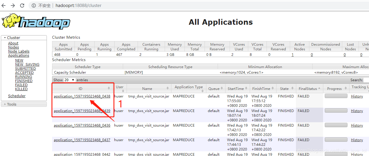 查看网页:http://hadoop(主机名或IP地址):18088/cluster