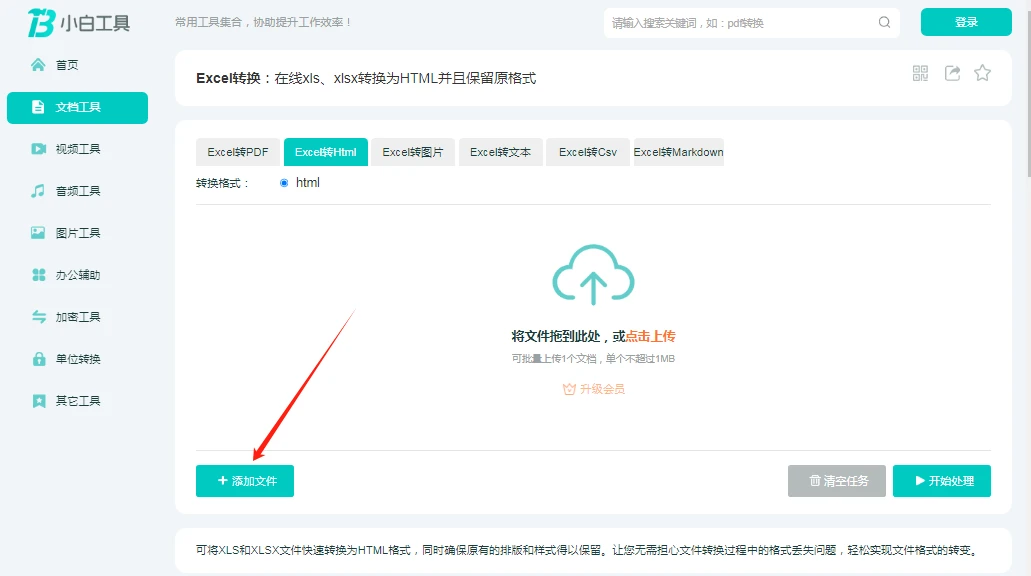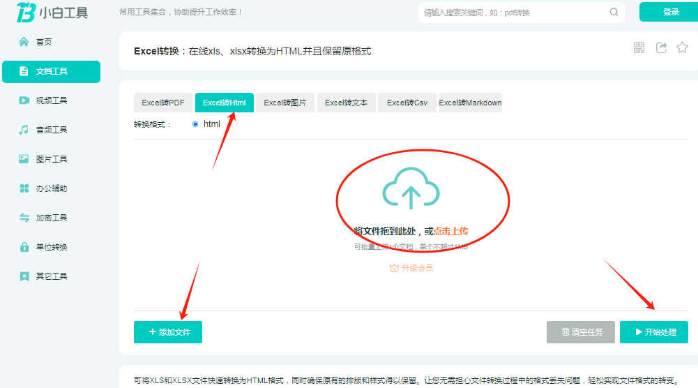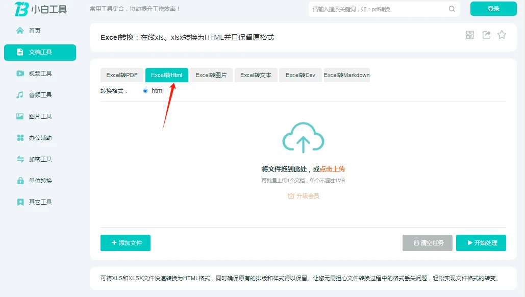 选择转换功能:在页面上轻松找到“Excel转Html”选项,该选项明确标识了支持在线将xls、xlsx转换为HTML,同时会保留原格式。