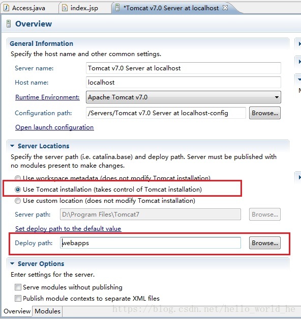 3、在“Server Locations”处选择“Use Tomcat installation”,可以清楚的看到默认是“Use Workspace metadata”,即上边所说的目录。然后在Deploy的path处写上webapps即可,如下图所示: