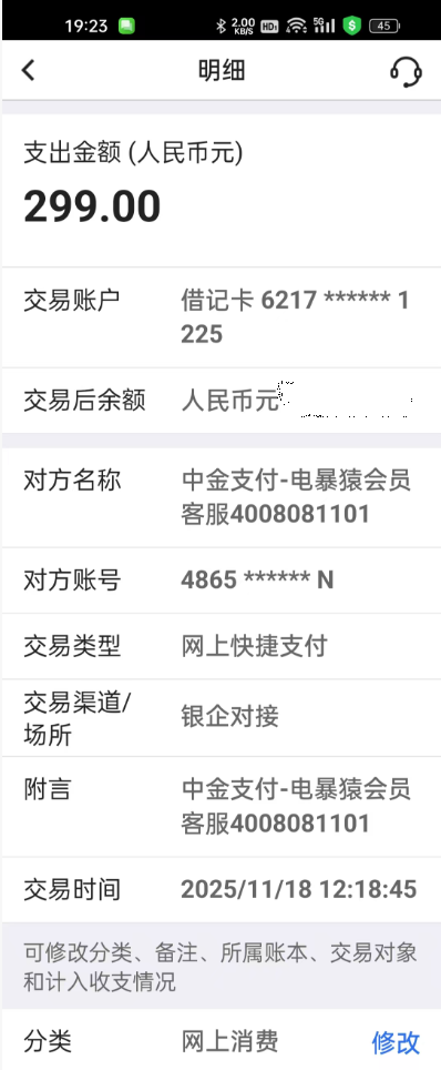 今天家里老人反馈无缘无故被扣费299, 查询中国银行支付记录,是 中金支付-电暴猿会员扣费,都没听过这个东西。