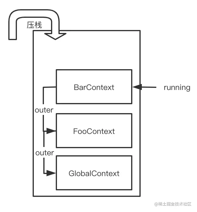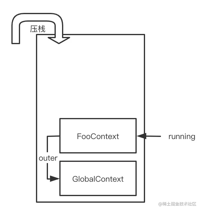 运行到foo()时,识别为函数调用,此时创建一个新的执行上下文FooContext并入栈,将FooContext内词法环境的outer引用指向全局执行上下文的词法环境,移动running指针指向这个新的上下文:
