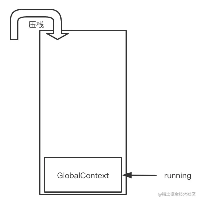 当这段JS程序开始运行时,它会创建一个全局执行上下文GlobalContext,其中会初始化一些全局对象或全局函数,如代码中的console,undefined,isNaN。将全局执行上下文压入执行栈,通常JS引擎都有一个指针running指向栈顶元素: