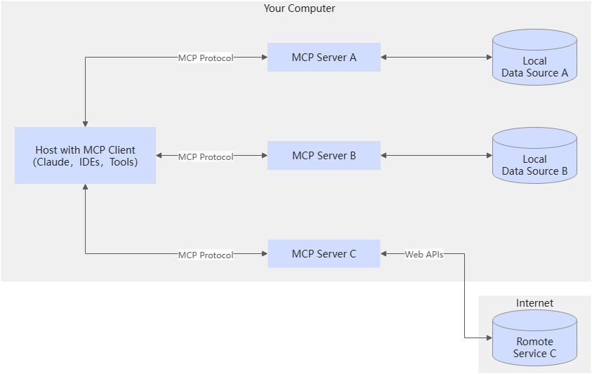MCP 采用C/S(客户端/服务端)架构,以下是 MCP 官方展示的架构: