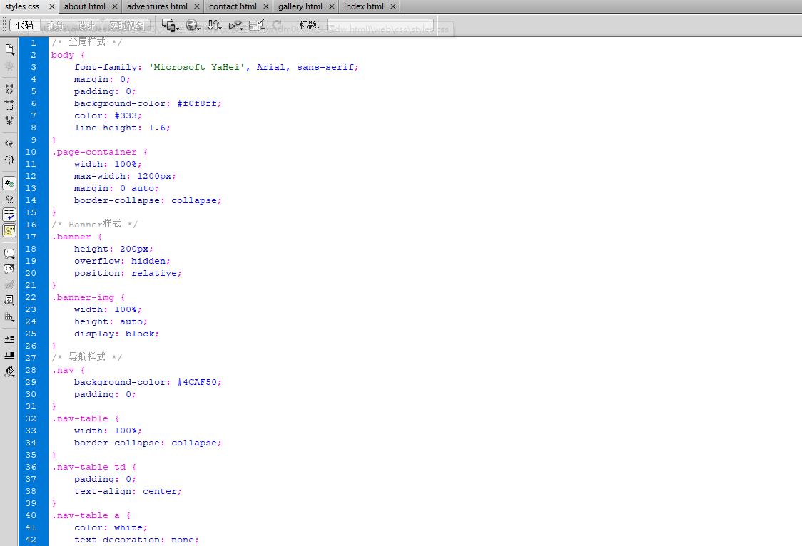 本实例应用html5+css+js, 导航菜单可点击进入各页面、banner轮播图,图片鼠标悬停动态效果等。代码精简,适用于大学生网页课程作业设计,毕业设计等。本网页支持如Dreamweaver、HBuilder、Text 、Vscode 等任意html编辑软件进行编辑修改;支持包括IE、Firefox等主流浏览器。在Dw设计模式下排版整齐。