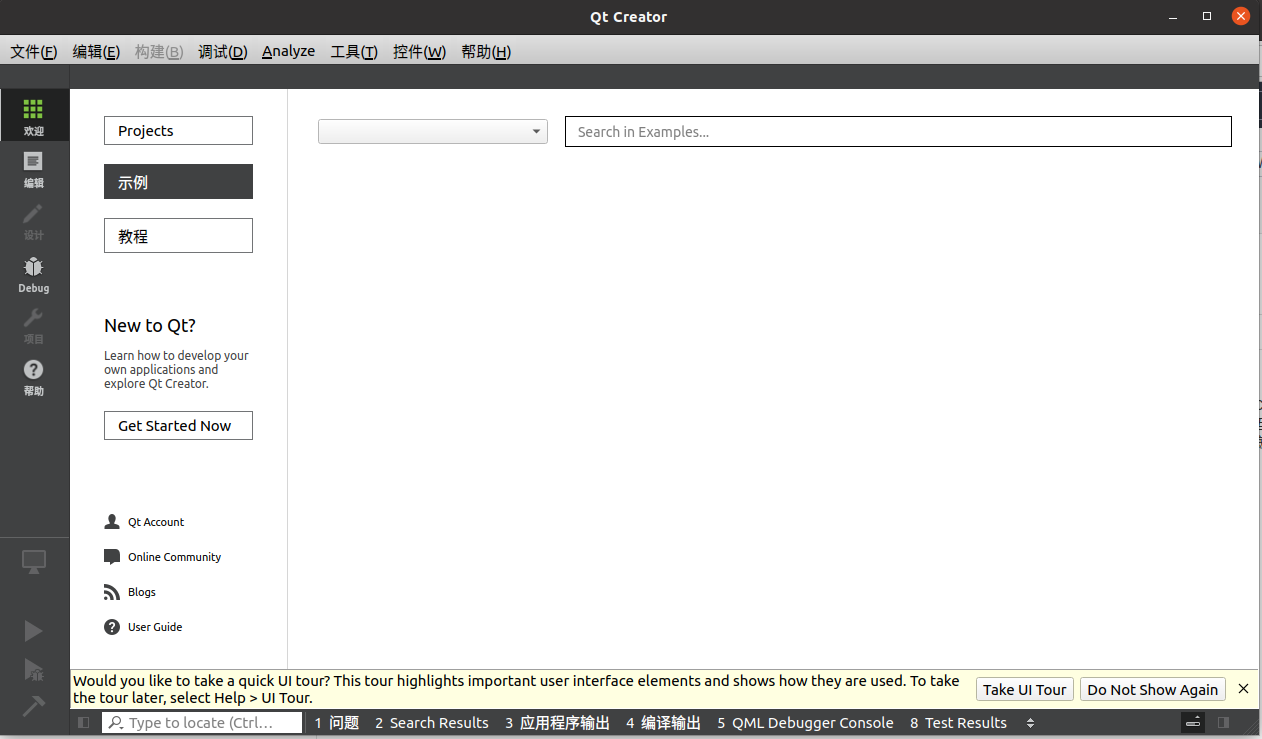 点击win徽标键或在终端窗口输入命令 qtcreator 打开qtcreator。 打开的界面如下