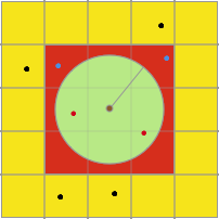 如上图所示,令左图的中心为搜索中心,绿色圆形区域为目标区域,所有点为待搜索的位置对象,红色点则为满足条件的位置对象。