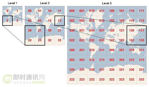 这其实是一个问题,本质上是对所有的元素对象进行了一次初步筛选。 在多层geohash网格中,每个低等级的geohash网格都是由4个高一级的网格拼接而成(如下图)。