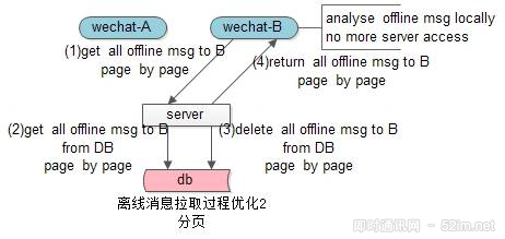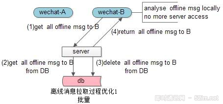 先拉取各个好友的离线消息数量,真正用户B进去看离线消息时,才往服务器发送拉取请求(手机端为了节省流量,经常会使用这个按需拉取的优化)。