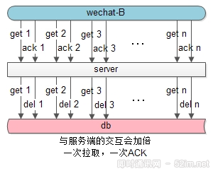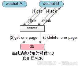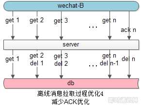 如同在线消息的应用层ACK机制一样,离线消息拉时,不能够直接删除数据库中的离线消息,而必须等应用层的离线消息ACK(说明用户B真的收到离线消息了),才能删除数据库中的离线消息。这个应用层的ACK可以通过实时消息通道告之服务端,也可以通过服务端提供的REST接口,以更通用、简单的方式通知服务端。
