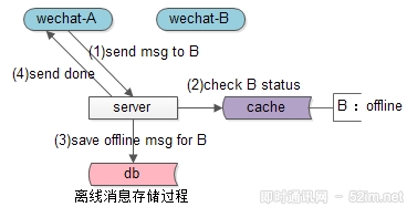 - Step 3:服务器将此条消息以离线消息的形式持久化存储到DB中(当然,具体的持久化方案可由您IM的具体技术实现为准);