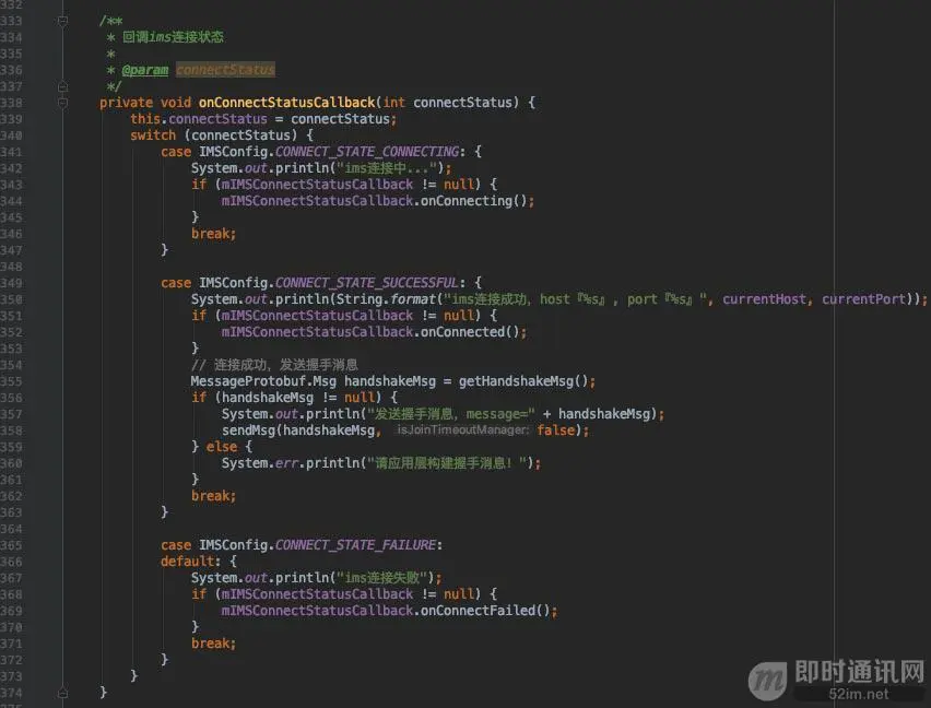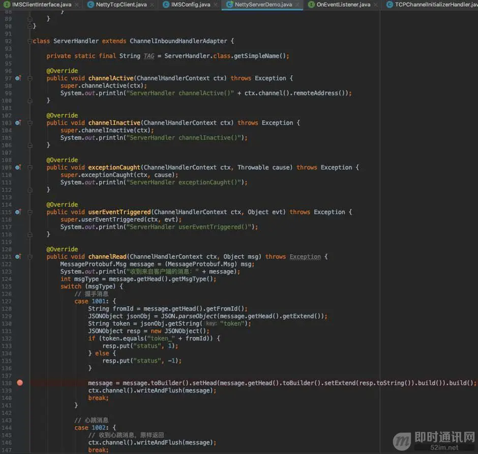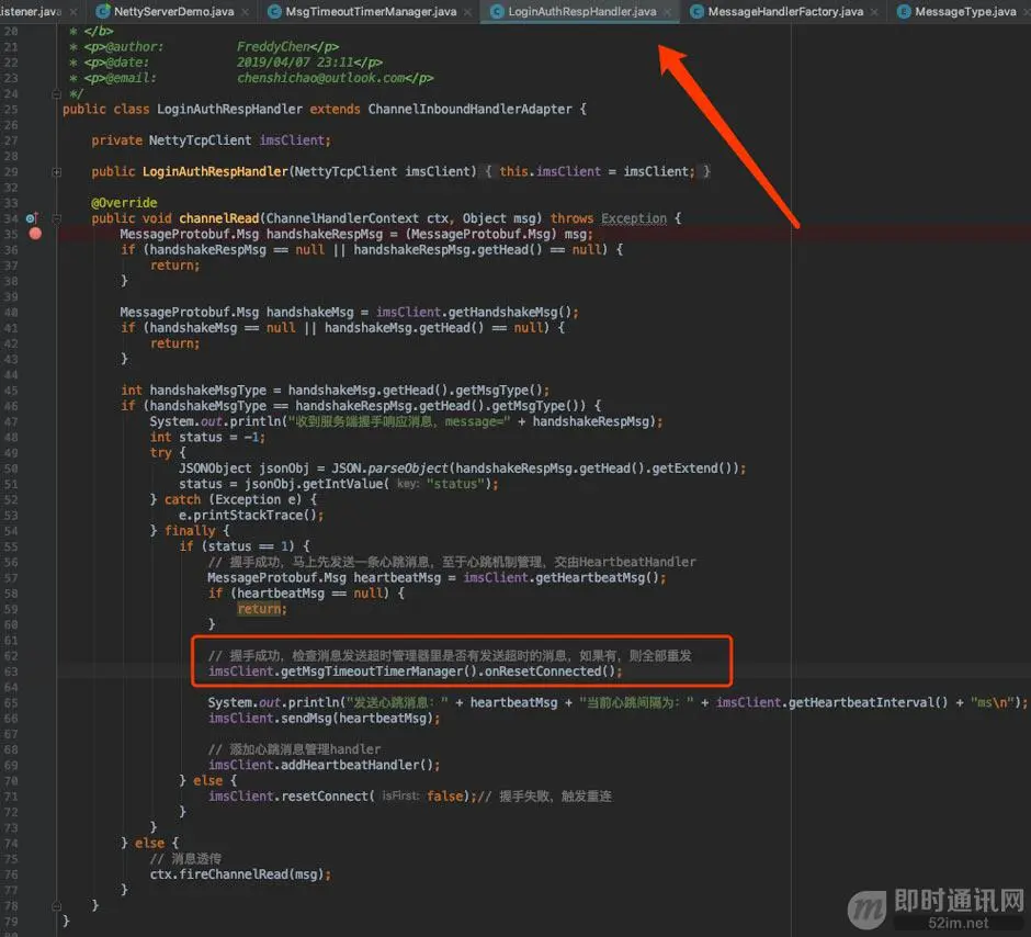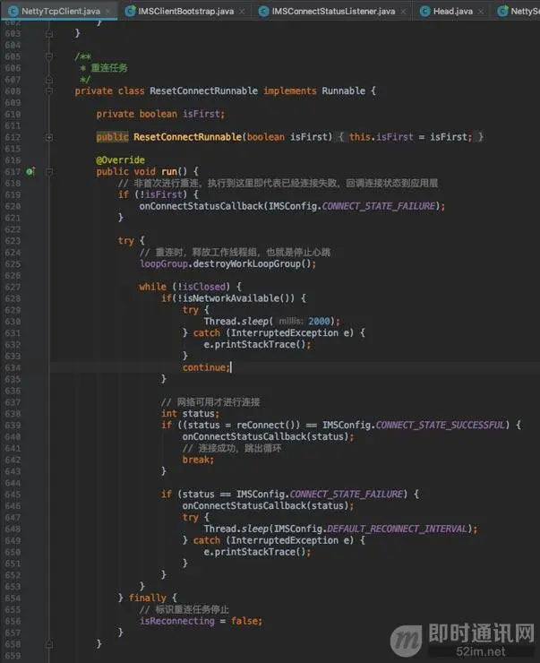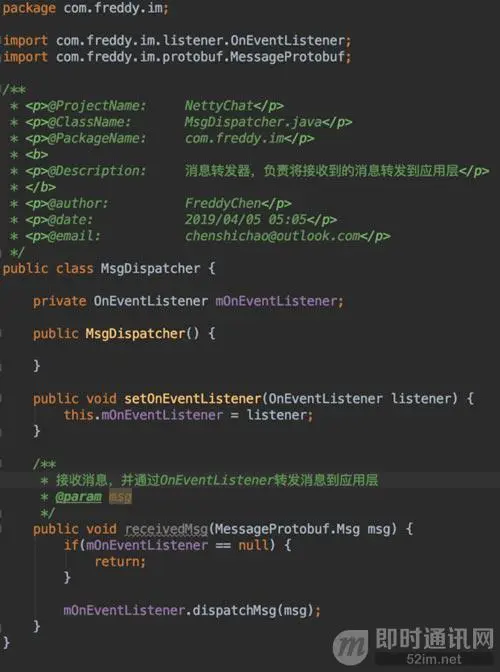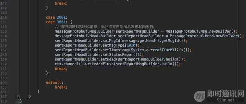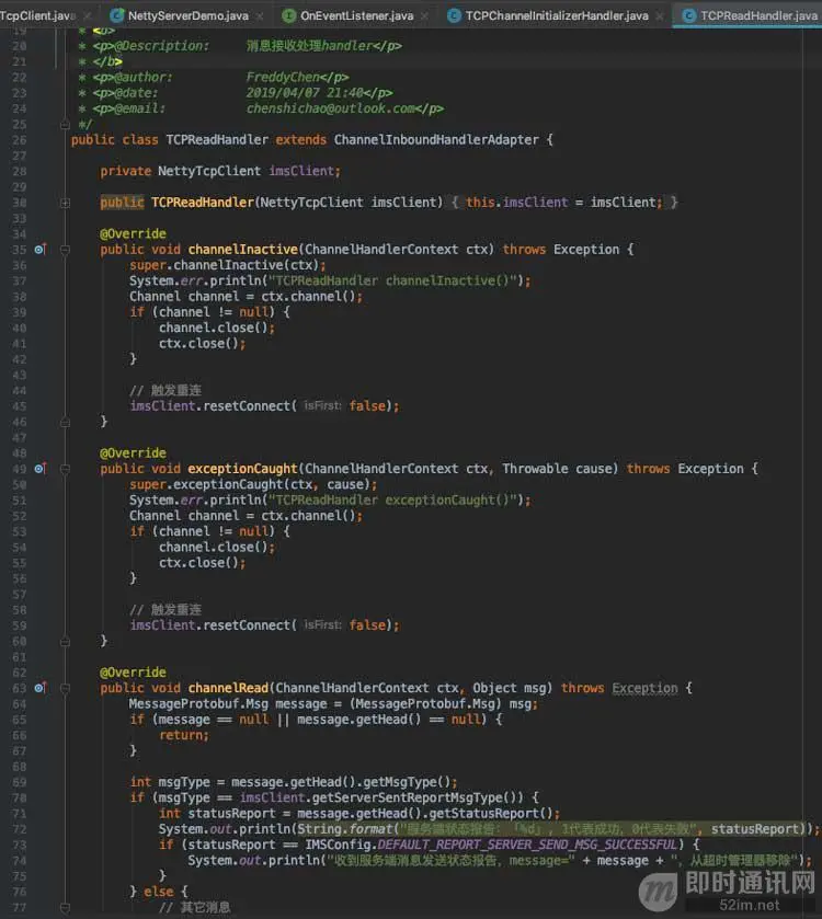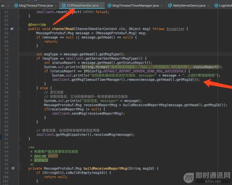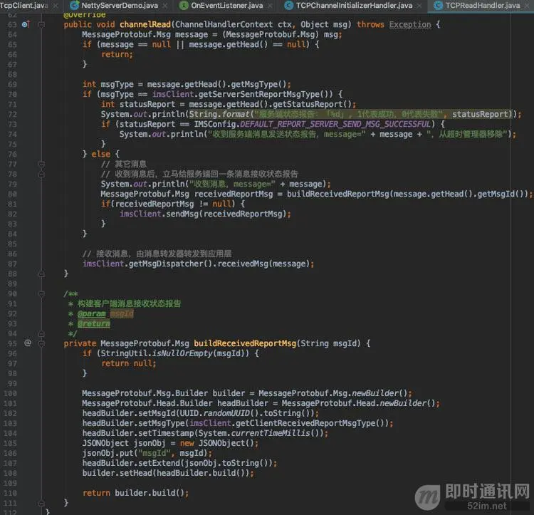 下面讲到消息重发机制的时候会详细地讲。在else里,收到其他消息后,会立马给服务端返回一个消息接收状态报告,告诉服务端,这条消息我已经收到了,这个动作,对于后续需要做的离线消息会有作用。如果不需要支持离线消息功能,这一步可以省略。最后,调用消息转发器,把接收到的消息转发到应用层即可。