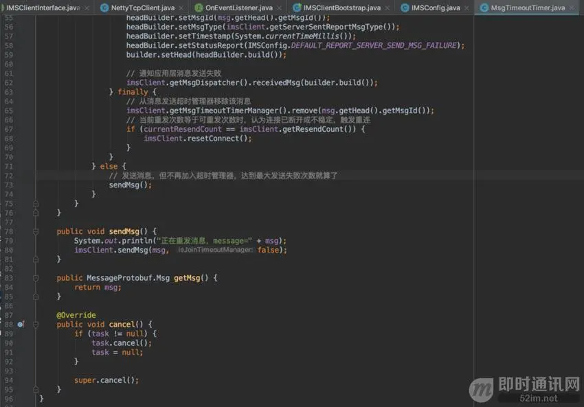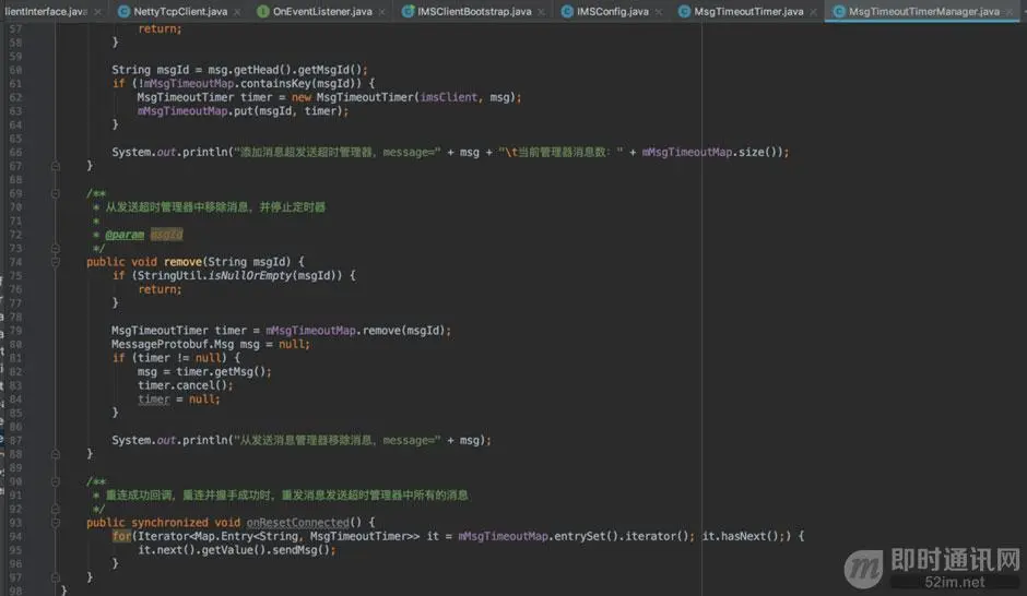 说一下逻辑吧:发送消息时,除了心跳消息、握手消息、状态报告消息外,消息都加入消息发送超时管理器,立马开启一个定时器,比如每隔5秒执行一次,共执行3次,在这个周期内,如果消息没有发送成功,会进行3次重发,达到3次重发后如果还是没有发送成功,那就放弃重发,移除该消息,同时通过消息转发器通知应用层,由应用层决定是否再次重发。如果消息发送成功,服务端会返回一个消息发送状态报告,客户端收到该状态报告后,从消息发送超时管理器移除该消息,同时停止该消息对应的定时器即可。