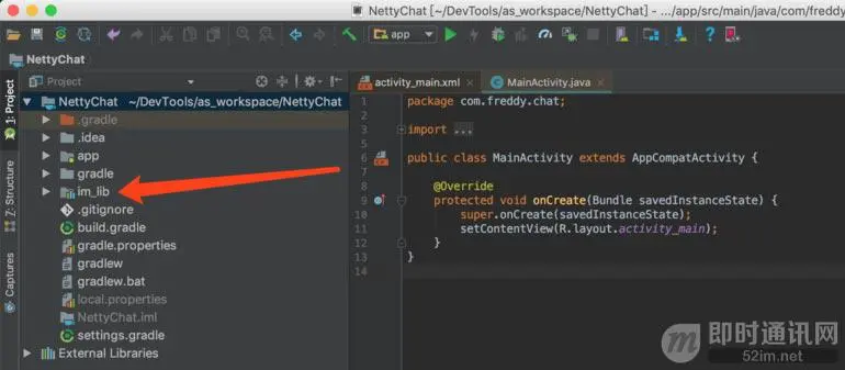 首先,我们新建一个Project,在Project里面再新建一个Android Library,Module名称暂且叫做im_lib,如图所示: