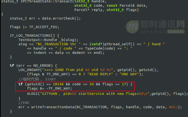 前面既然说了,TIM强行修改了ONEWAY的方式。可以去掉该flags, 为了调试,这里就针对TIM,并且code=34(即START_SERVICE_TRANSACTION), 并且修改flag的case下: