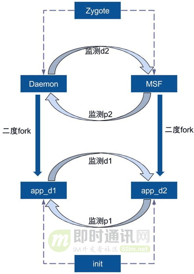 - 1.2)同时再采用一对退孤给init进程的app_d进程相互监听文件的方式来获得对方进程是否存活的状态; 而这两个进程都有间接由Daemon和MSF进程所fork而来;双重保险。