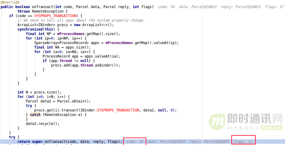 下面告诉大家如何看一个Binder调用是否同步, 如下图最后一个参数代表的是FLAG_ONEWAY值,等于0则代表的是同步, 等于1则代表的是异步。
