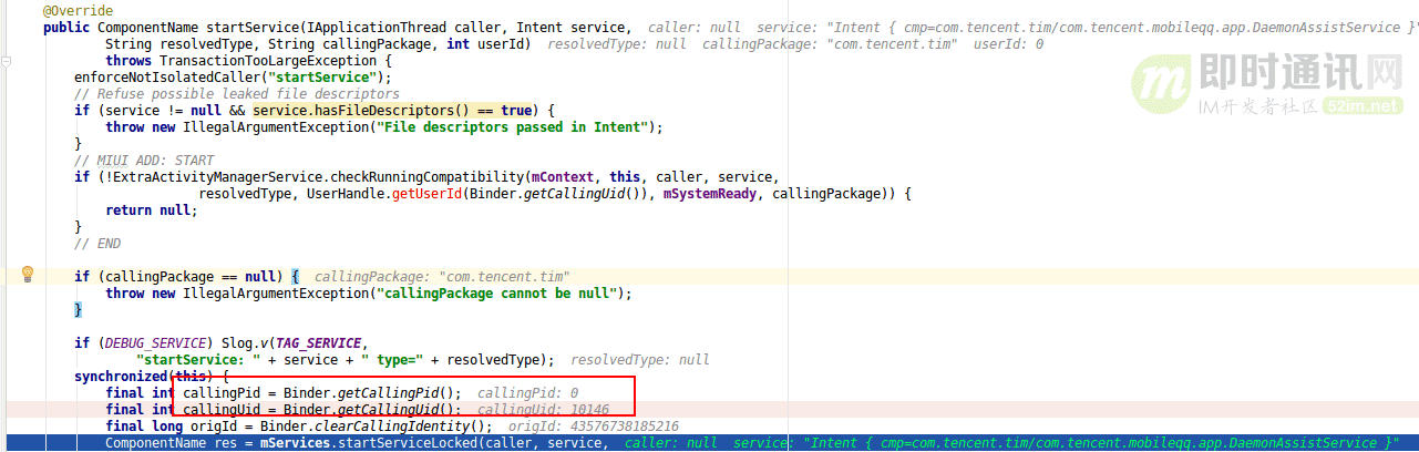 以上代码是framework的框架代码,startService最终都会调用到这里来,所以callingPid必然是不可能出现为0的情况,让我们看不透到底哪个进程把com.tencent.tim: Daemon拉起的。