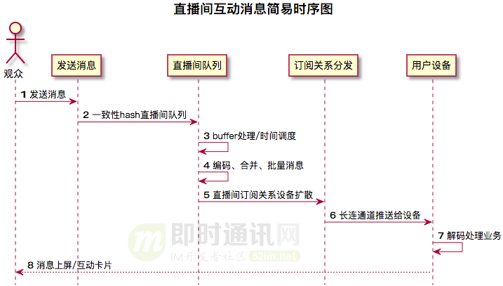 即:观众互动消息 -> 网关接入 -> 应用系统Buffer(秒级直播间维度消息) -> 编码、合并、批量消息流 -> 直播间维度设备扩散 -> 设备长连通道推送 -> 设备接收 -> 解码消息 -> 业务处理。