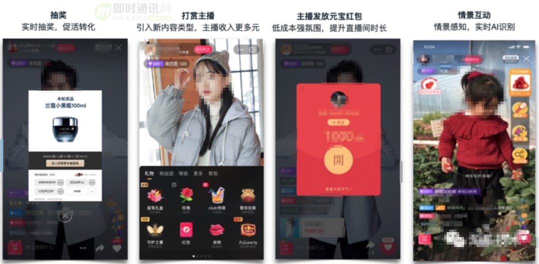 用户在整个“互动消息”场景下,可以进行实时分享、聊天、客服沟通、商家优惠、商家优惠活动和红包以及商品秒杀等。