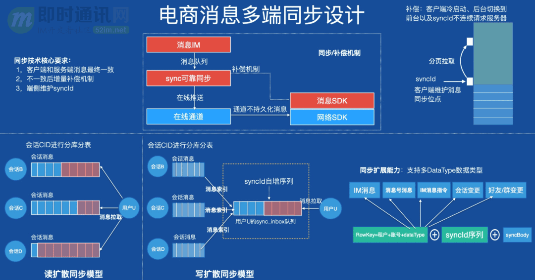 - 2)无论是单聊还是群聊等会话消息,写入用户维度同步队列,集中获取同步数据;